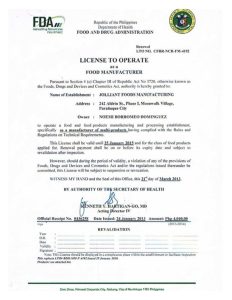 DOH-FDA License to Operate as a Food Manufacturer