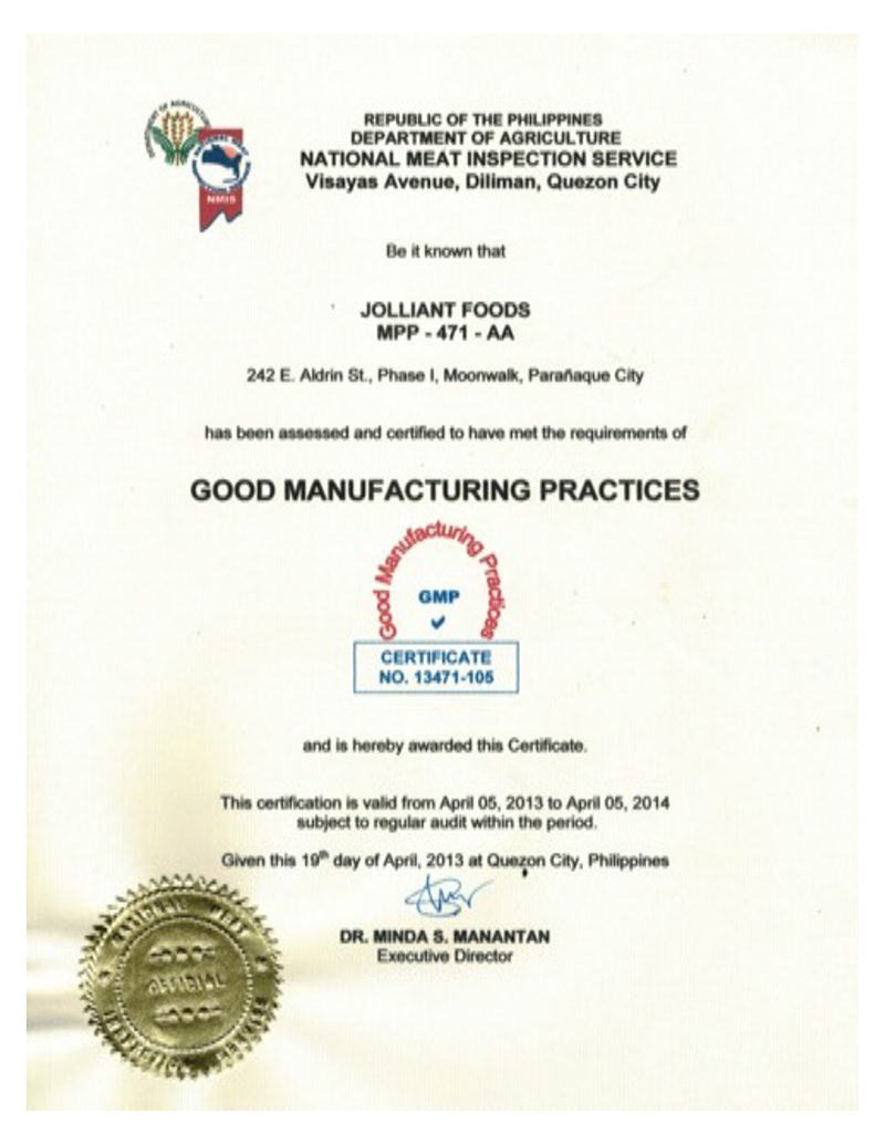 DA-NMIS Certified for Good Manufacturing Practices (GMP)